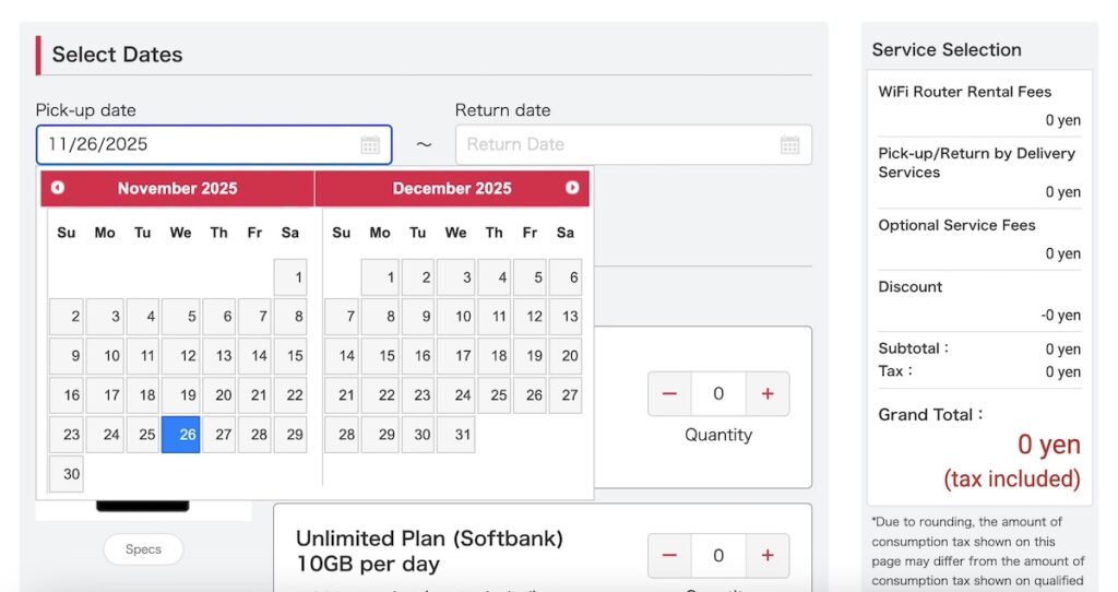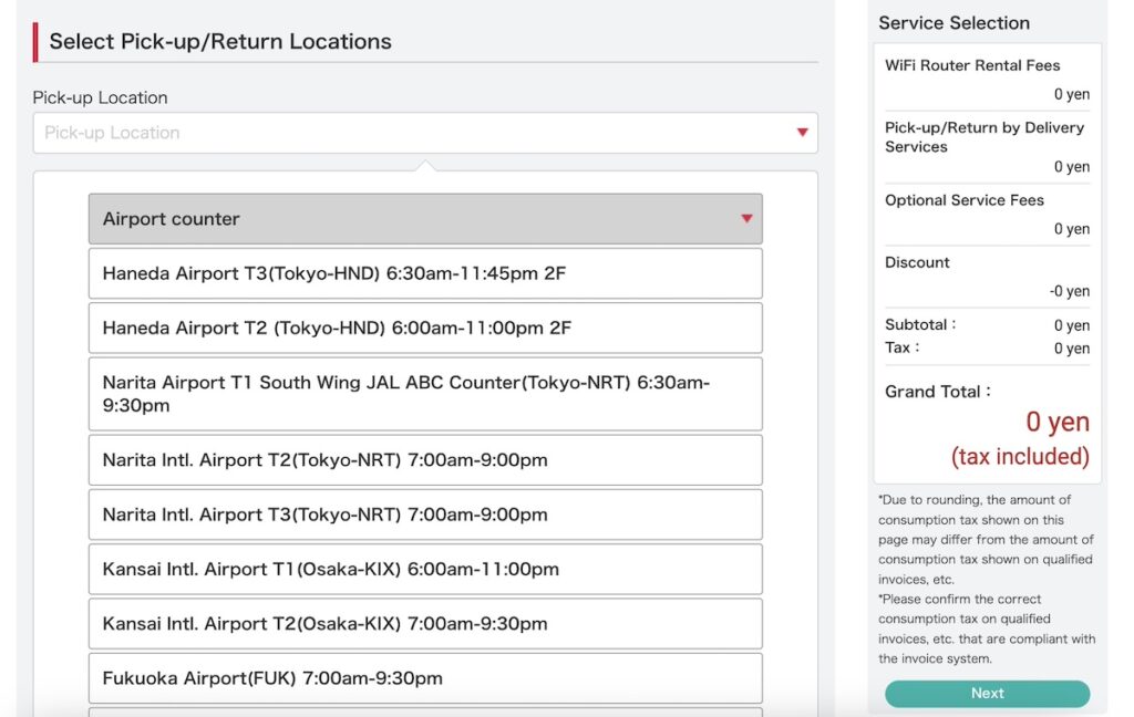 4. Choose Pick-up and Return method. Simply choose the airport where you will land when you arrive to Japan, and after that choose airport from where you will depart. As soon as you choose it, the price will be calculated on the right side of the screen.