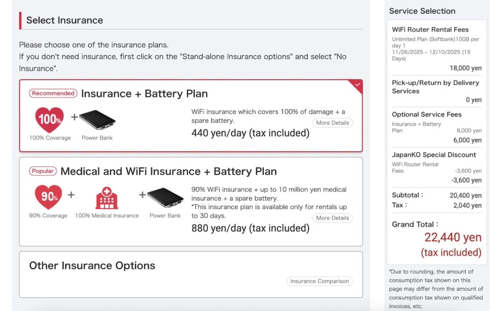 5. As you can see, 20% discount from Japanko Official is applied to my purchase. You can also choose the Insurance option that you would like to have. If you don’t want Insurance, then choose “Other Insurance options“, and after that “No Insurance“.
